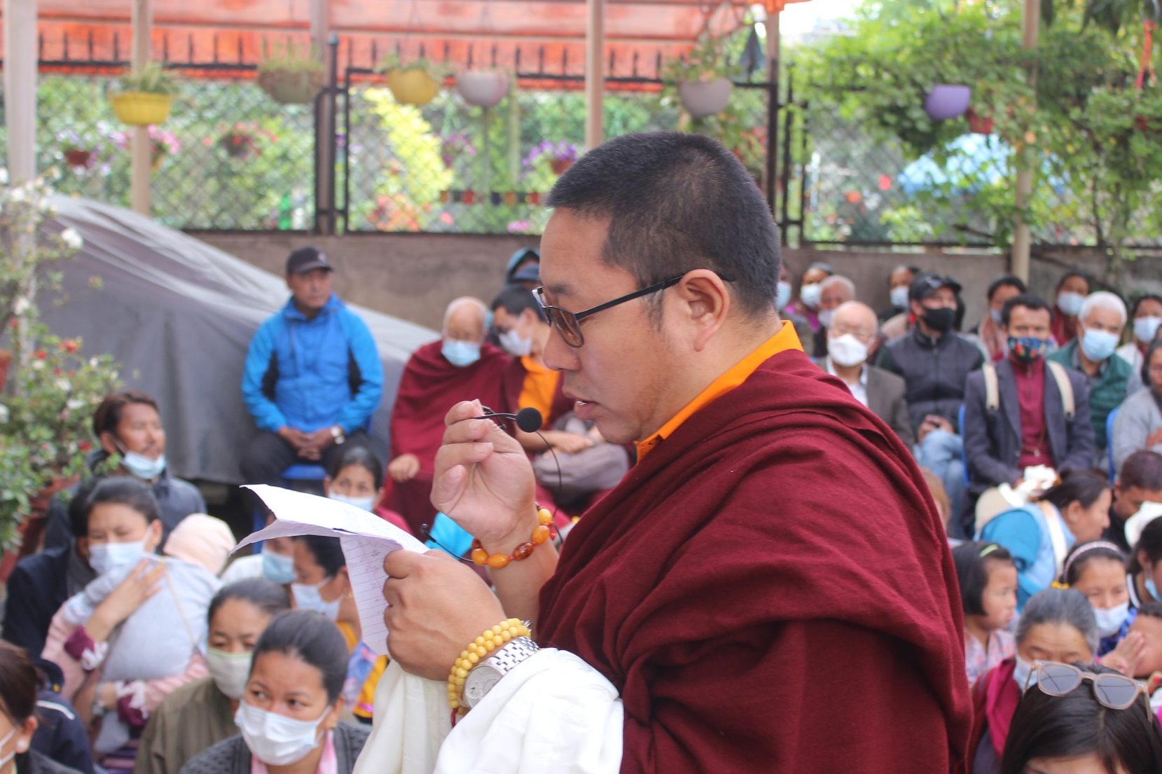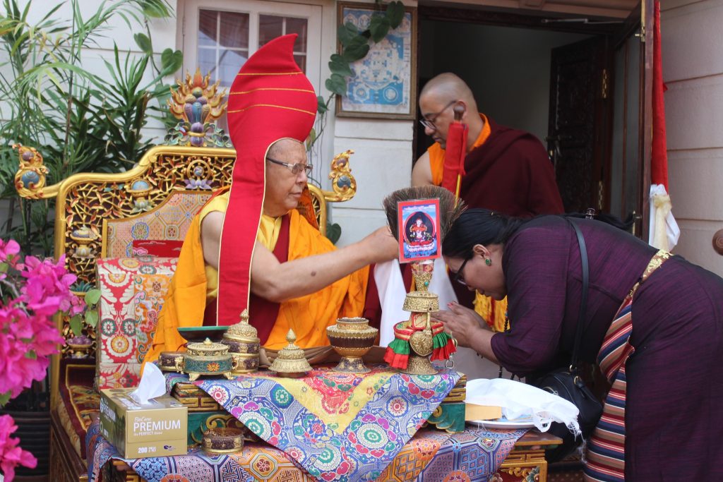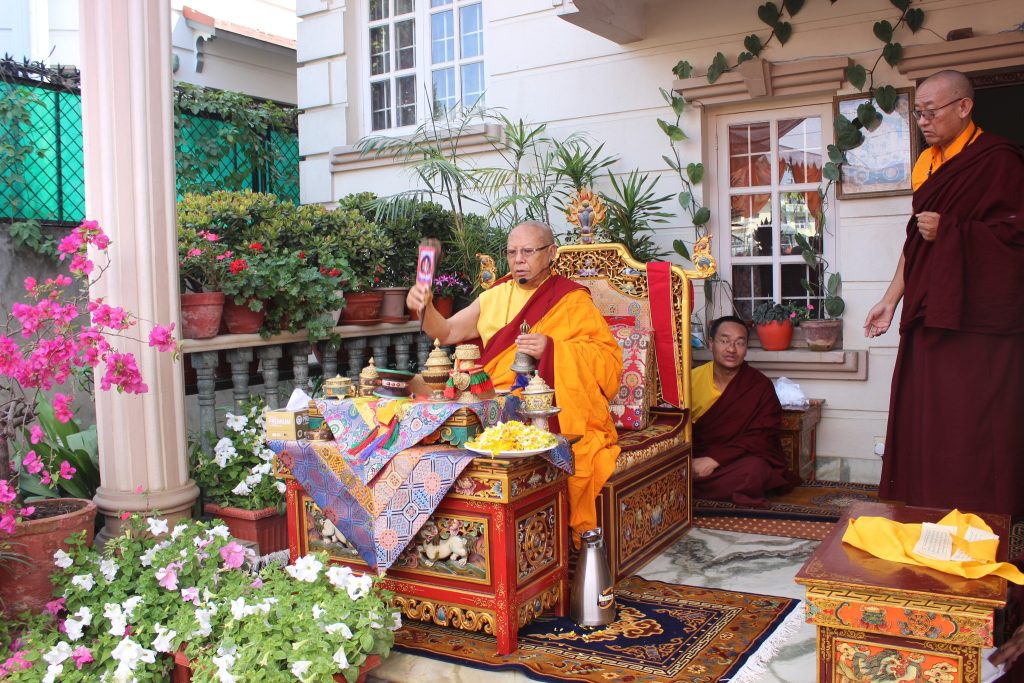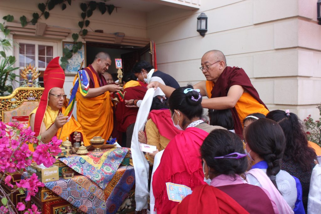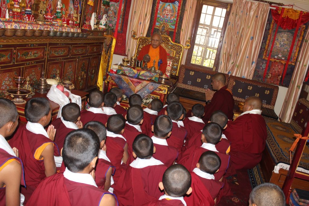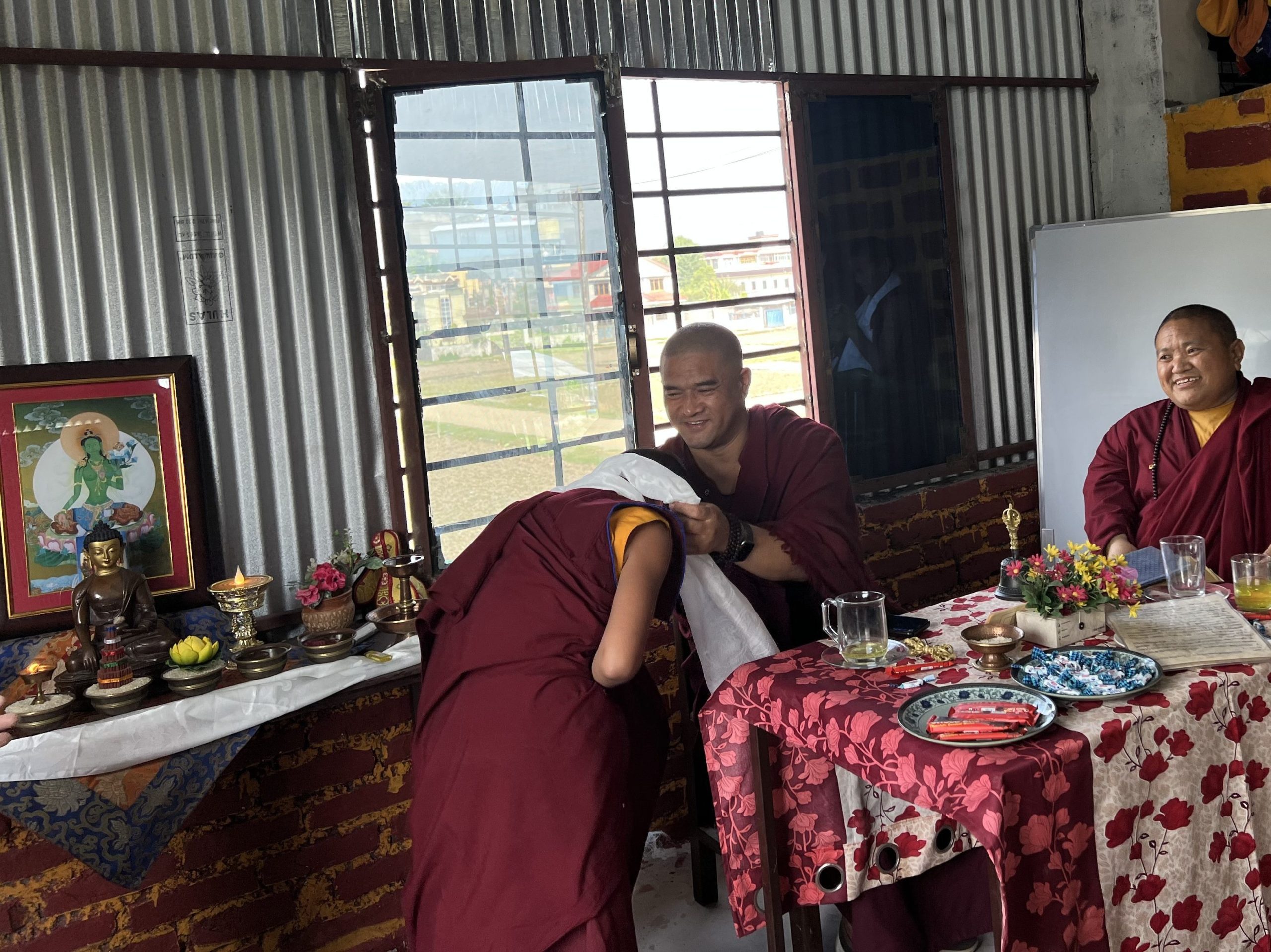 Khenpo Pema Choephel offering scarf to all the monks for the inauguration of their new classroom